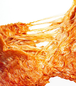 一、产品应用:拉丝蛋白的前处理拉丝蛋白的一般状态为干燥固形物(水分含量约10%,水分活度Aw约0.43),在使用前必须让拉丝蛋白吸水软化。充分吸水后的拉丝蛋白会完全软化,并表现出肉质纤维丝的质感。拉丝蛋白产品具有良好的结构和真实肉质纤维的组织,非常适合用于各类高级素食仿肉食品的加工,如素火腿、素鸡、素鱼、素汉堡、素热狗、素茶鹅、素牛排、素肉松等。 产品本身亦具有良好的吸水性、保油性,经过适当的加