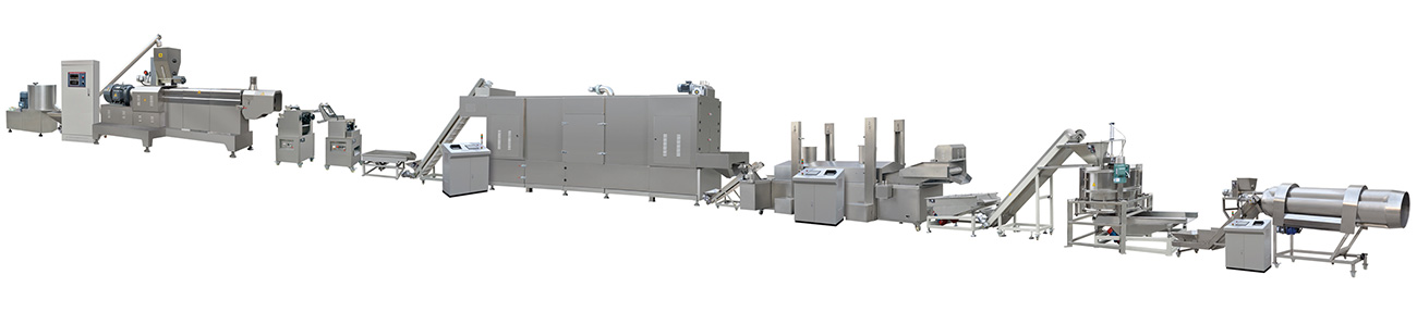 生产流程: 配料 → 混合 → 挤压膨化 → 压花 → 整形 → 输送 → 筛选 → 烘干 → 油炸 → 调味